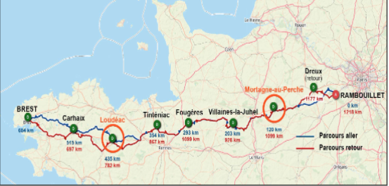 Fort de l’expérience acquise par chacun d’entre nous, le choix de l’implantation du camp de base se porte vite sur Loudéac située au kilomètre 435 à l’aller et au kilomètre 782 au retour,